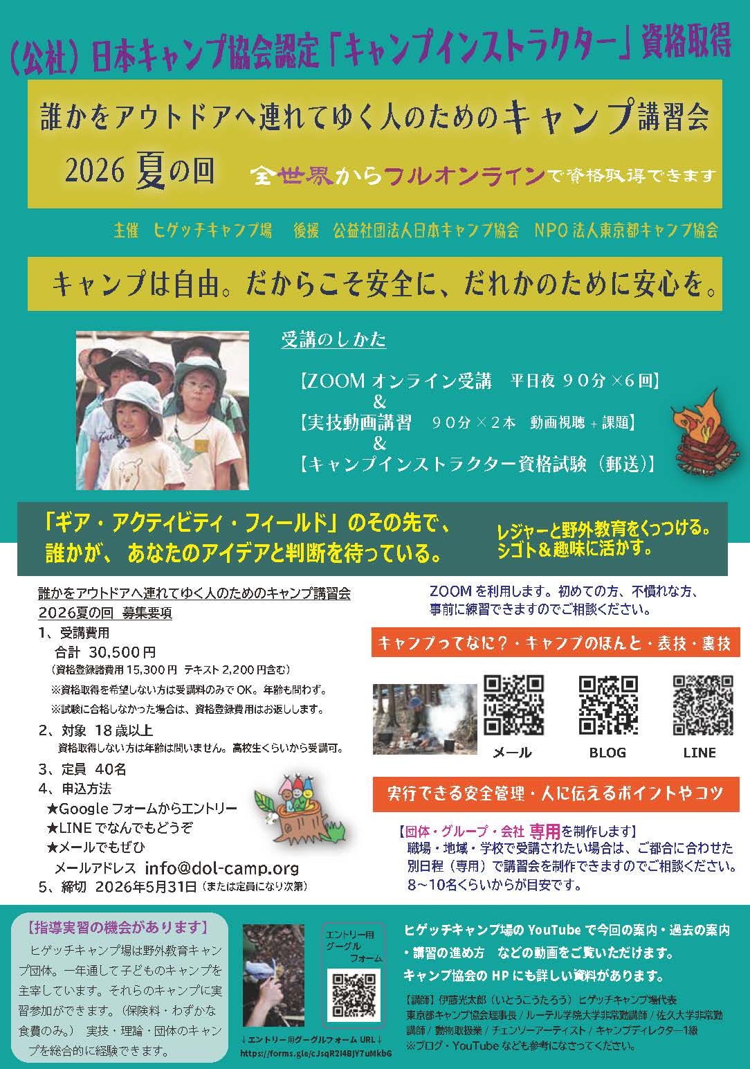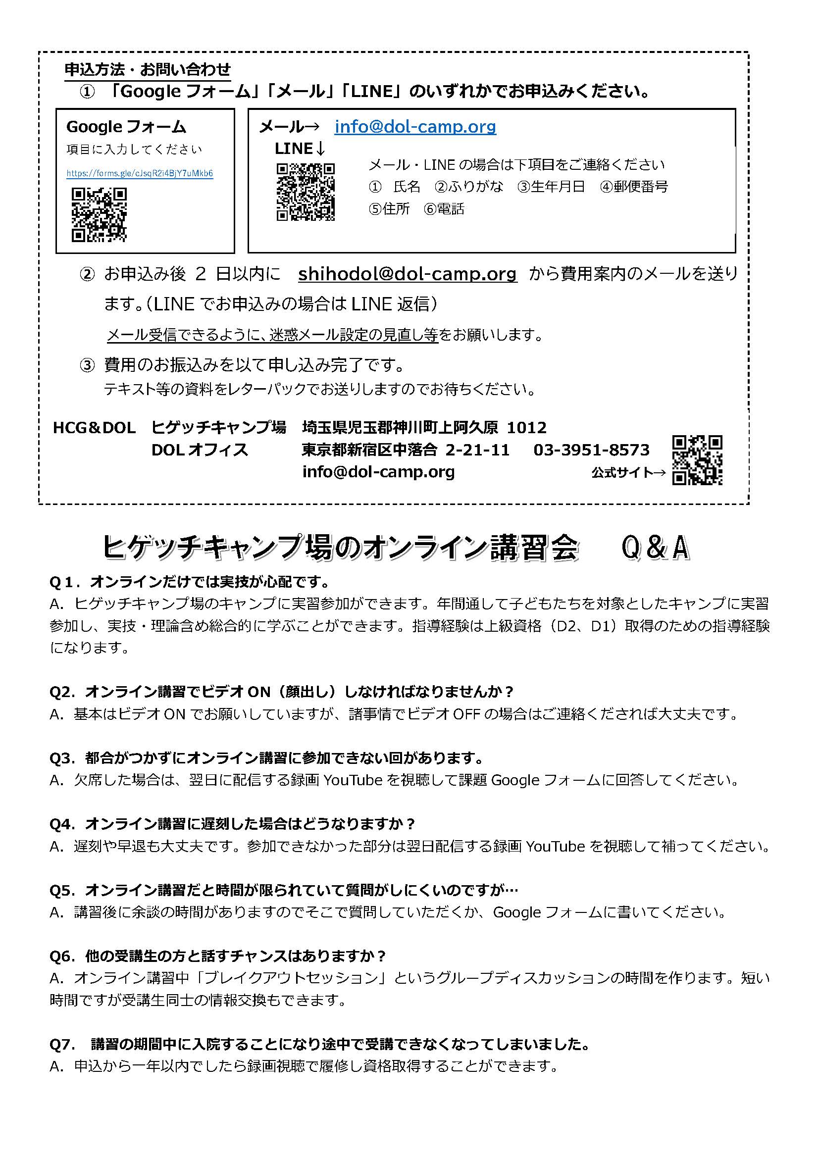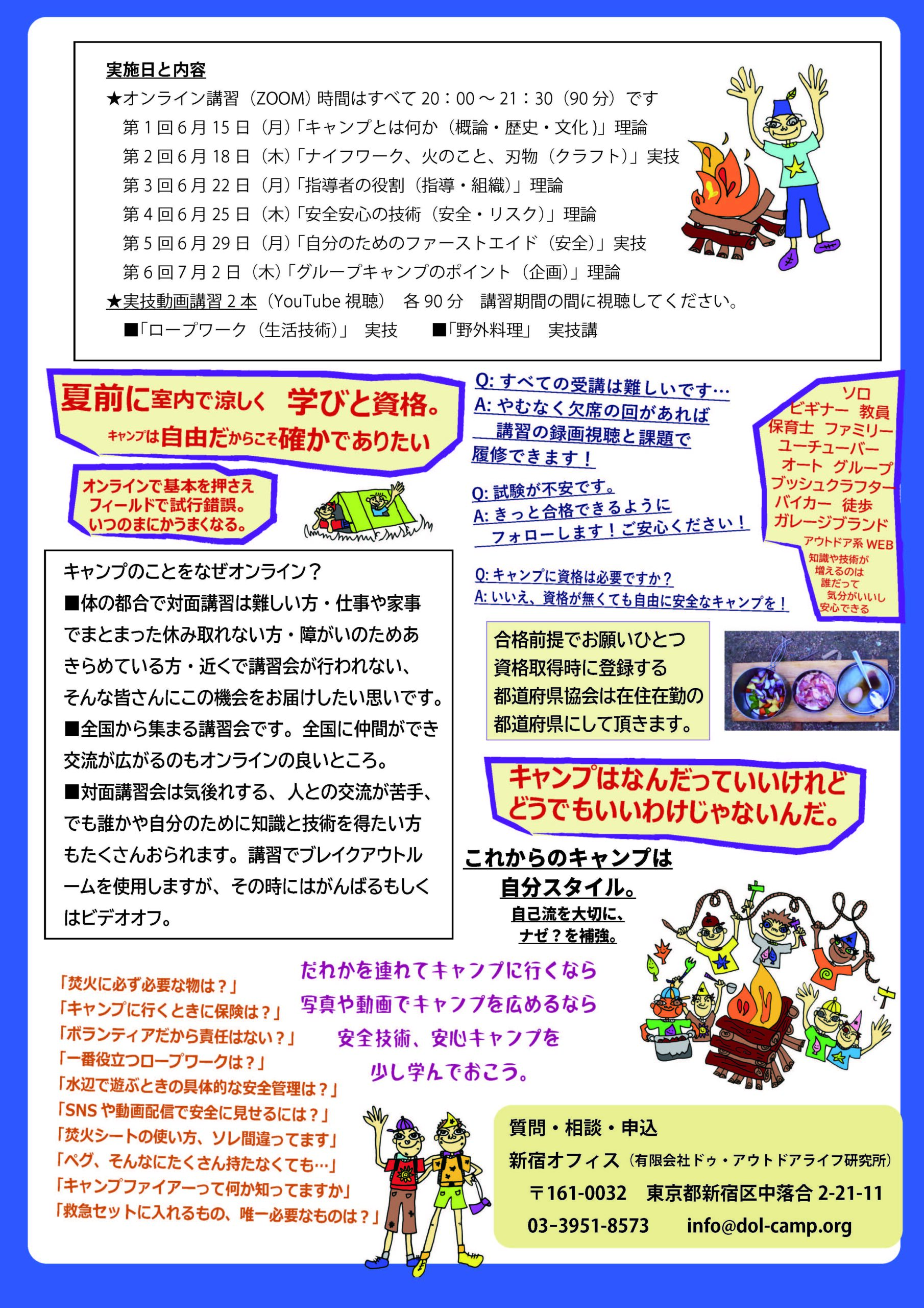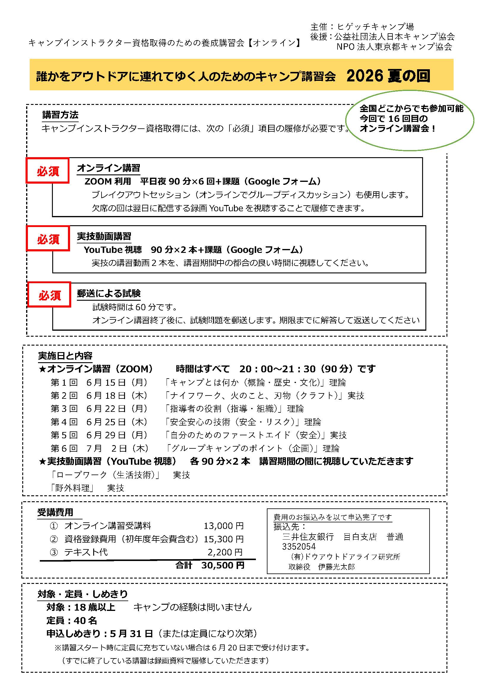 先のアンケートの通り、対面講習会に参加するのが困難な方々も受講でき、年齢性別居住地・移動距離の制限また健康上の不安さらにキャンプ経験の不安などをやわらげられるのがオンライン講習会の最大のメリットですから、実地活動が当然のキャンプ活動ですがキャンプの大切なところをしっかりお伝えできると思い至っています。